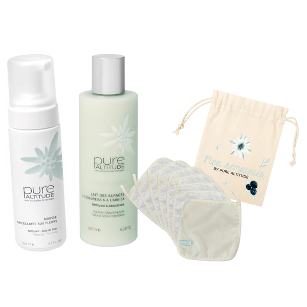 Micellair schuim met bloemen: Om make-up perfect te verwijderen, brengt u dit delicate schuim aan dat de laatste onzuiverheden verwijdert, waardoor uw huid helder en fris blijft. Gebruik vervolgens de gladde kant van het katoenen mousseline doekje om voorzichtig af te spoelen.